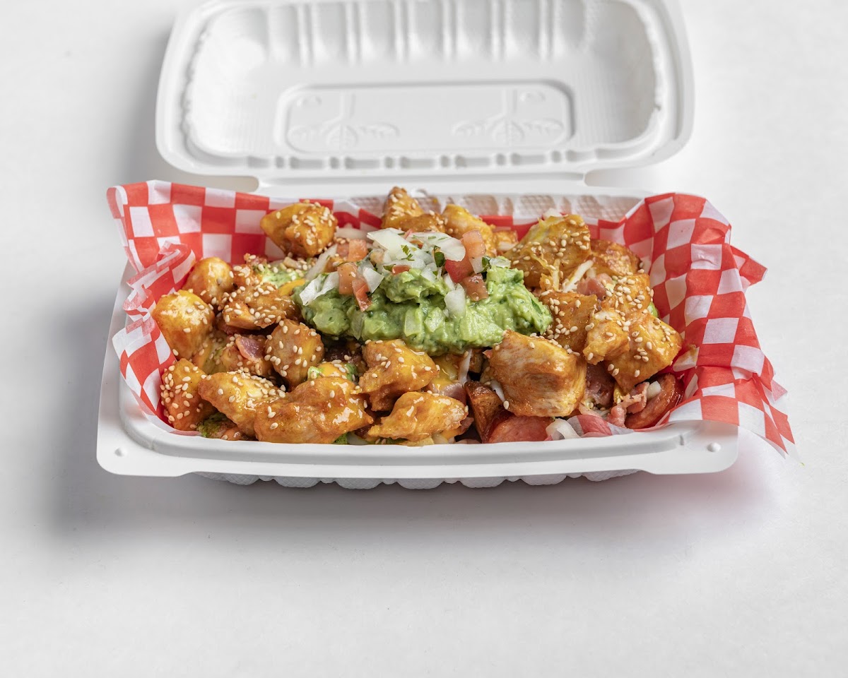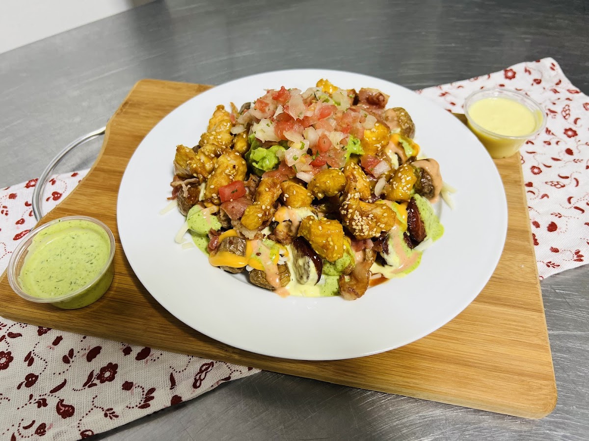 Fried Little potato and sausage, mozzarella, brick and cheddar cheese, bacon, guacamole, pico de Gallo, delicious craft sauces and our special chicken bites with honey mustard sauce and sesame seeds.